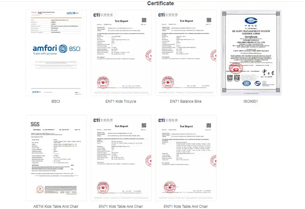 Sertifikasi kayataEN71lanASTMnuduhake yen kitatrike bocah lan bocah cilik kanggo wis ngalami tes specialized ing syarat-syarat apa bahan sing non-beracun, apa sudhut bakal Cut tangan, lan apa bagean tenan, lan wis ketemu standar safety.